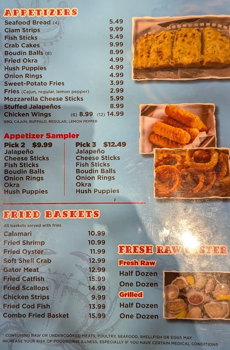 Feeds 2-3 people - 1 lb. snow crab legs, 1 lb. crawfish, 1 lb. shrimp, sausage "quarter pound", three potatoes, three corn.