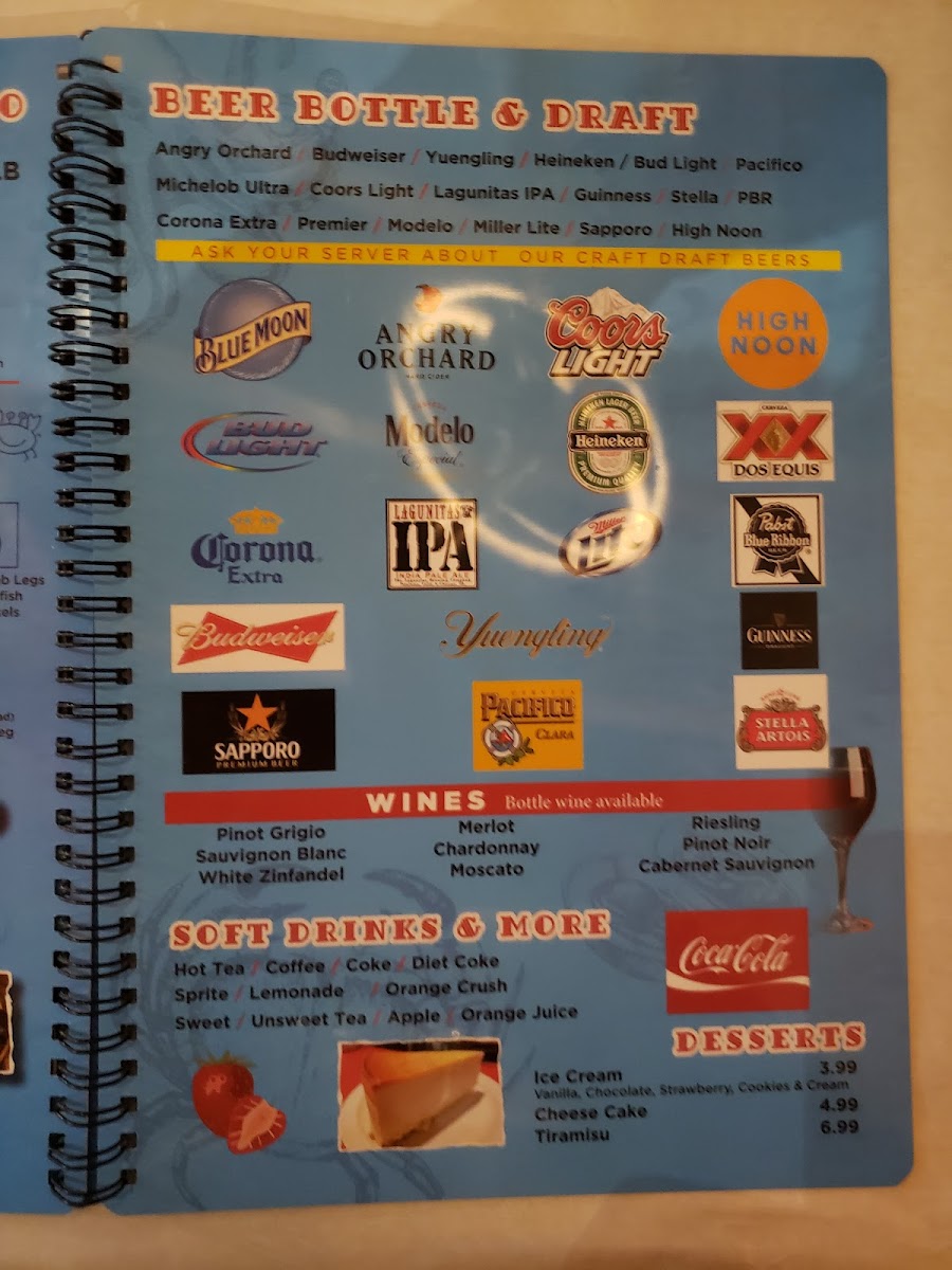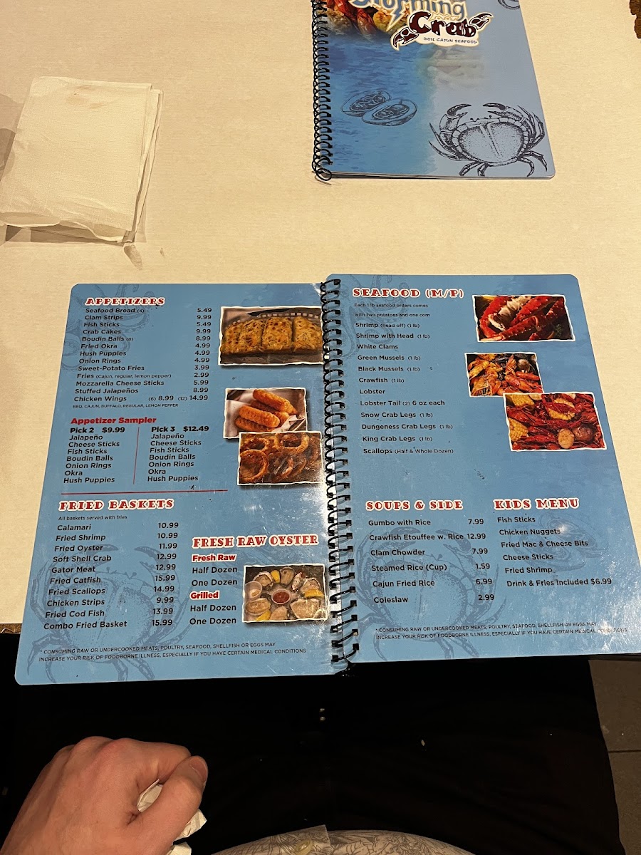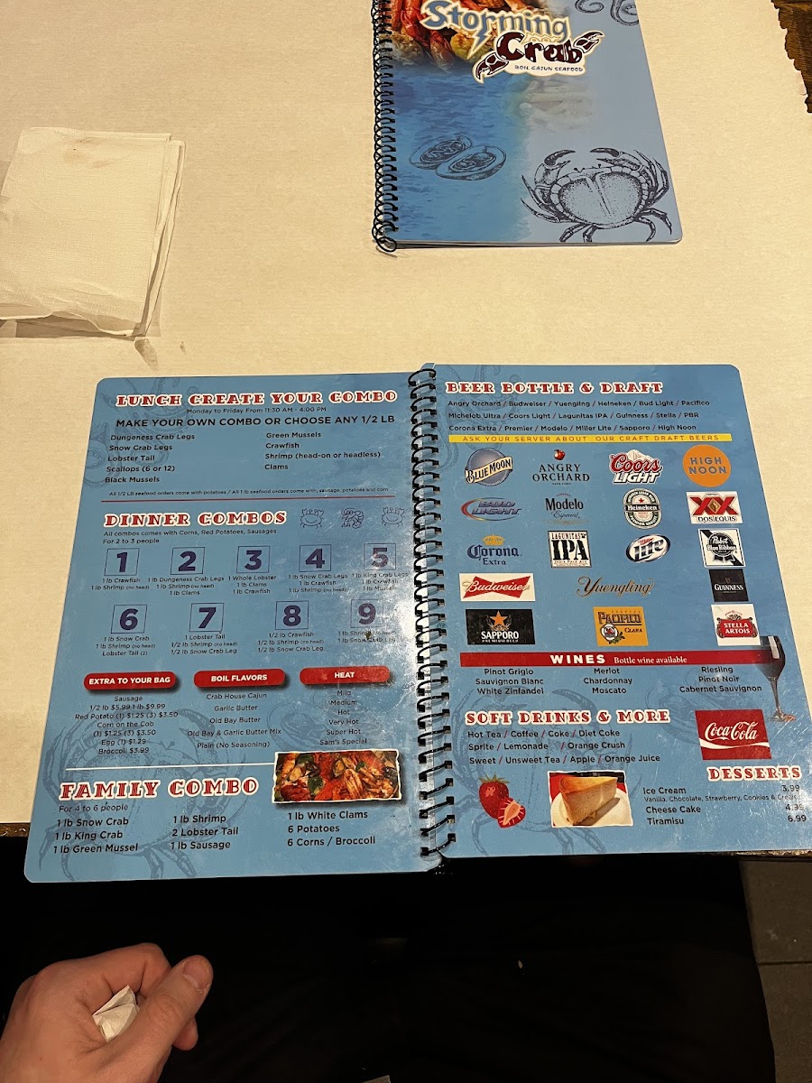 1/2 lb king crab legs, 1/2 lb. green mussels, one potato one corn.