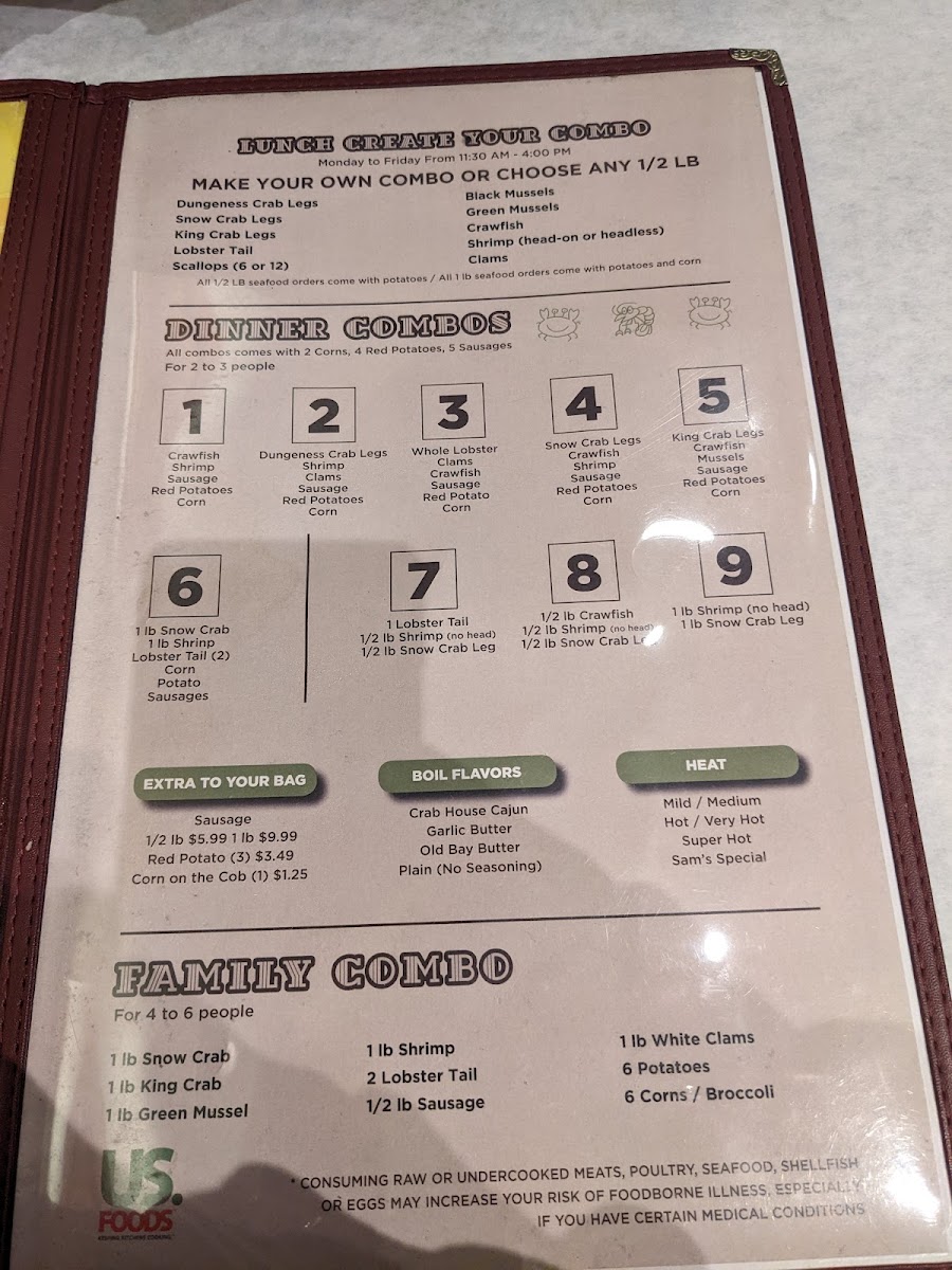 Feeds 1-2 Combo has 1/2lb. Shrimp, Snow Crab Legs, Crawfish, 3 potatoes, 1 corn, 1/4lb. sausage